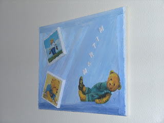 Também dei pasta simples em toda a tela e fiz relevos ao longo de toda a tela. Apliquei duas pequenas telas com ursos e colei na tela grande, bem como o urso grande. Por fim apliquei o nome dele em gesso.
